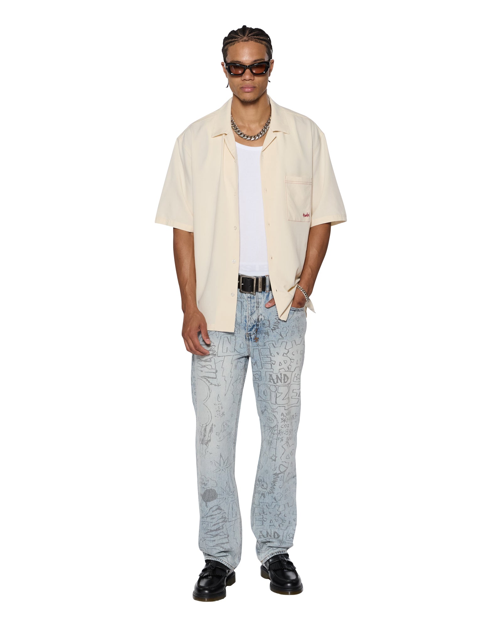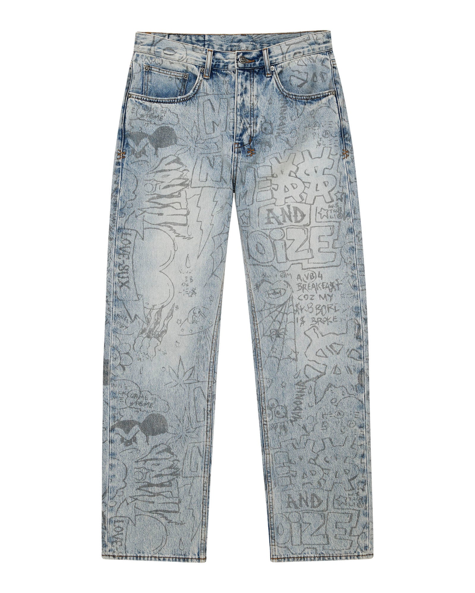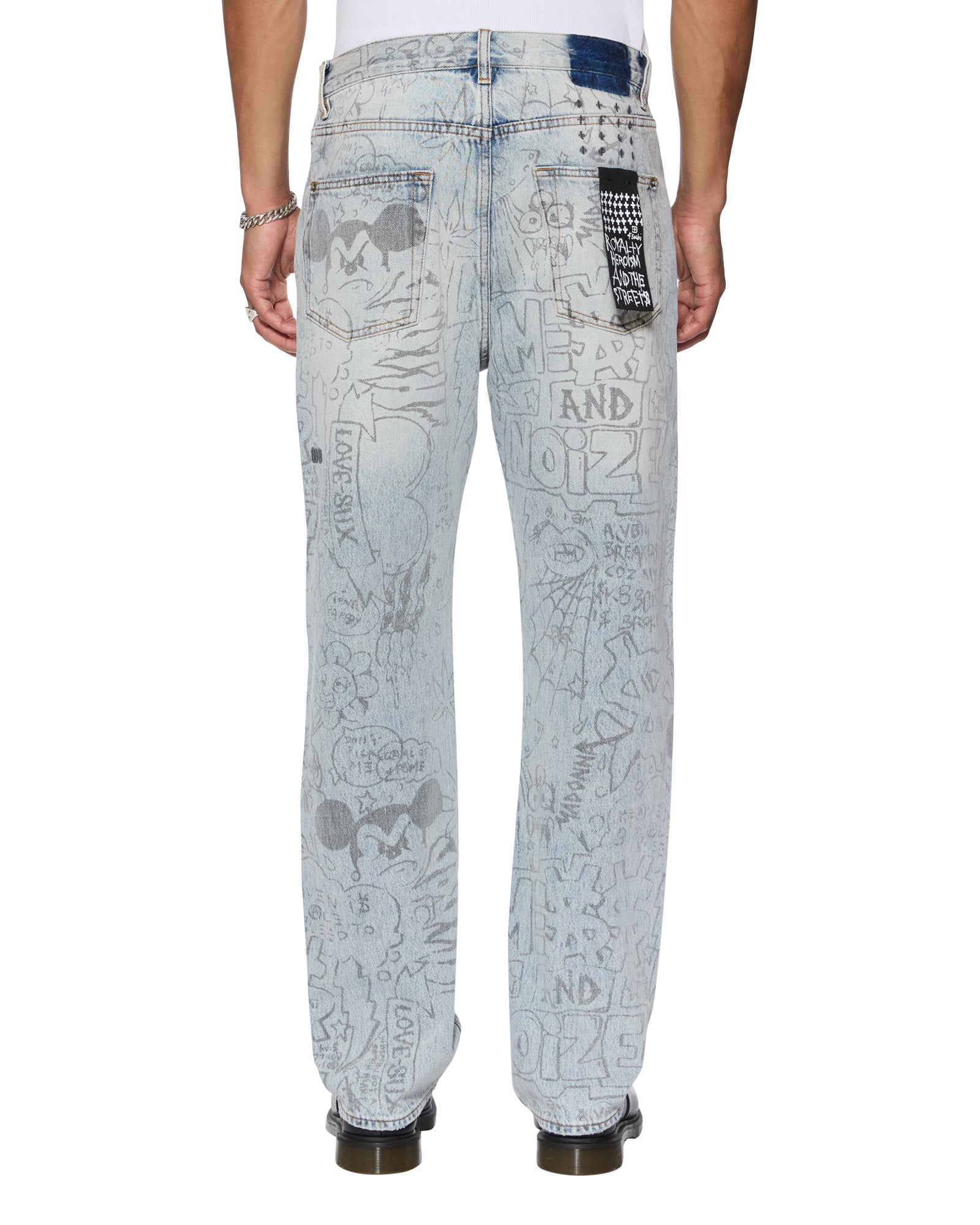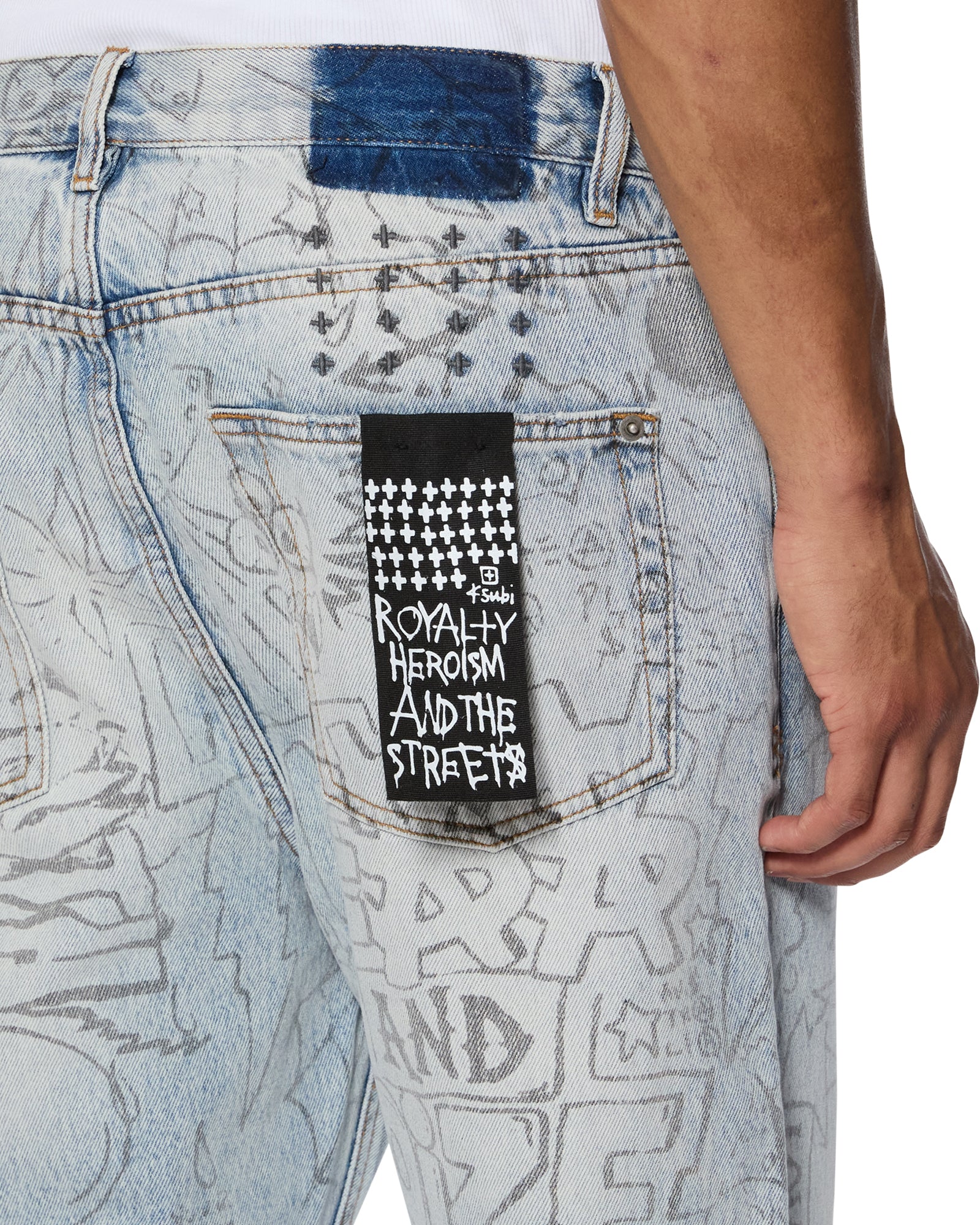 The Anti K Bunker Blue Noize is a mid-rise relaxed straight fit with a regular leg opening. Made from premium rigid denim with a heavy stone wash and light contrasting details. it features seasonal artwork printed all over the garment in a repeat pattern. Finished with T-box and 4×4 embroidery. ghost patching detailing. and Ksubi branded hardware.