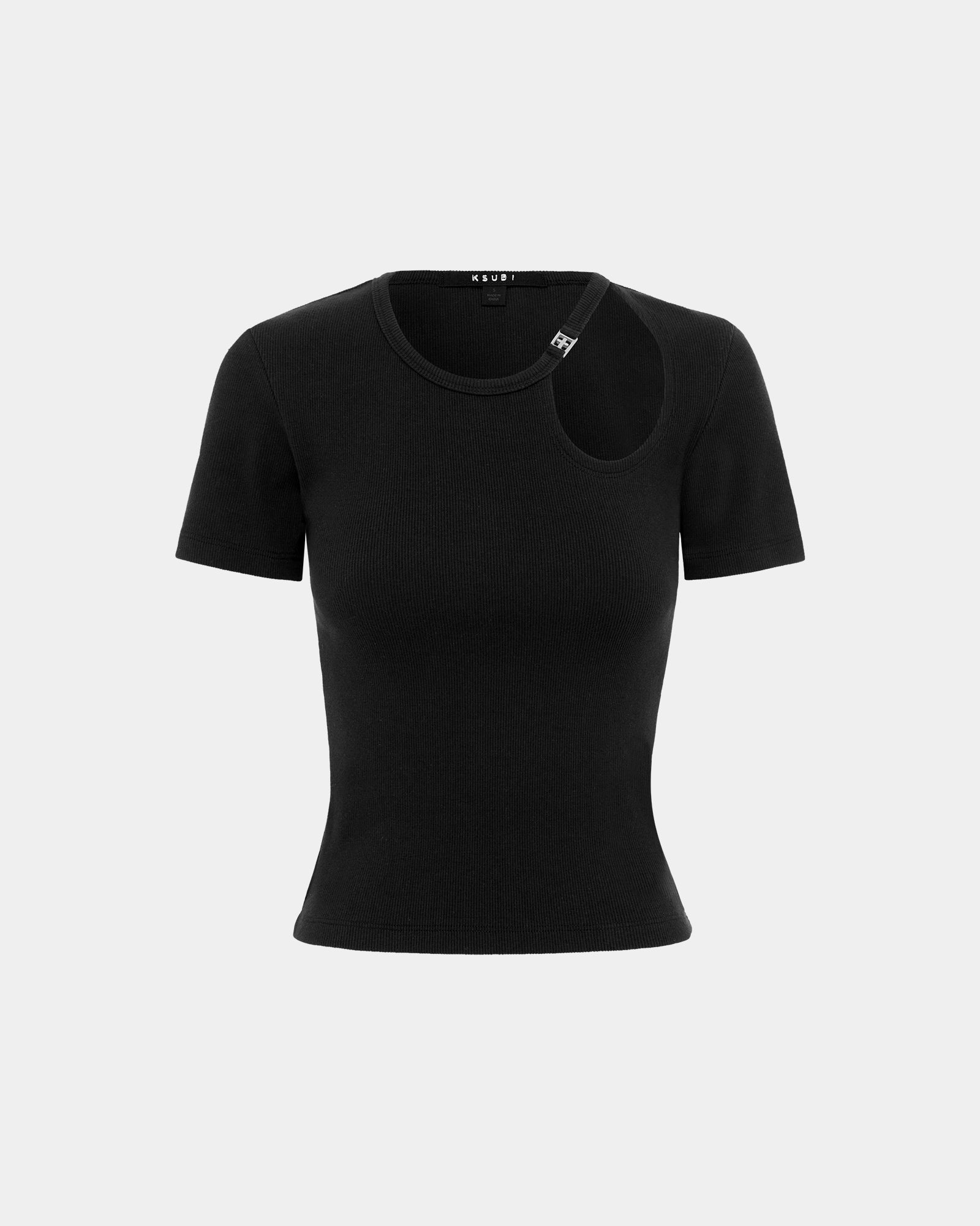 The Arise Cut Out Ss Tee Black is a basic ribbed t-shirt featuring an asymmetric cut out detail and a silver t-box charm at the left collarbone. Made from a premium cotton/elastane blend rib in a jet black colourway with tonal T-box branding on the side.