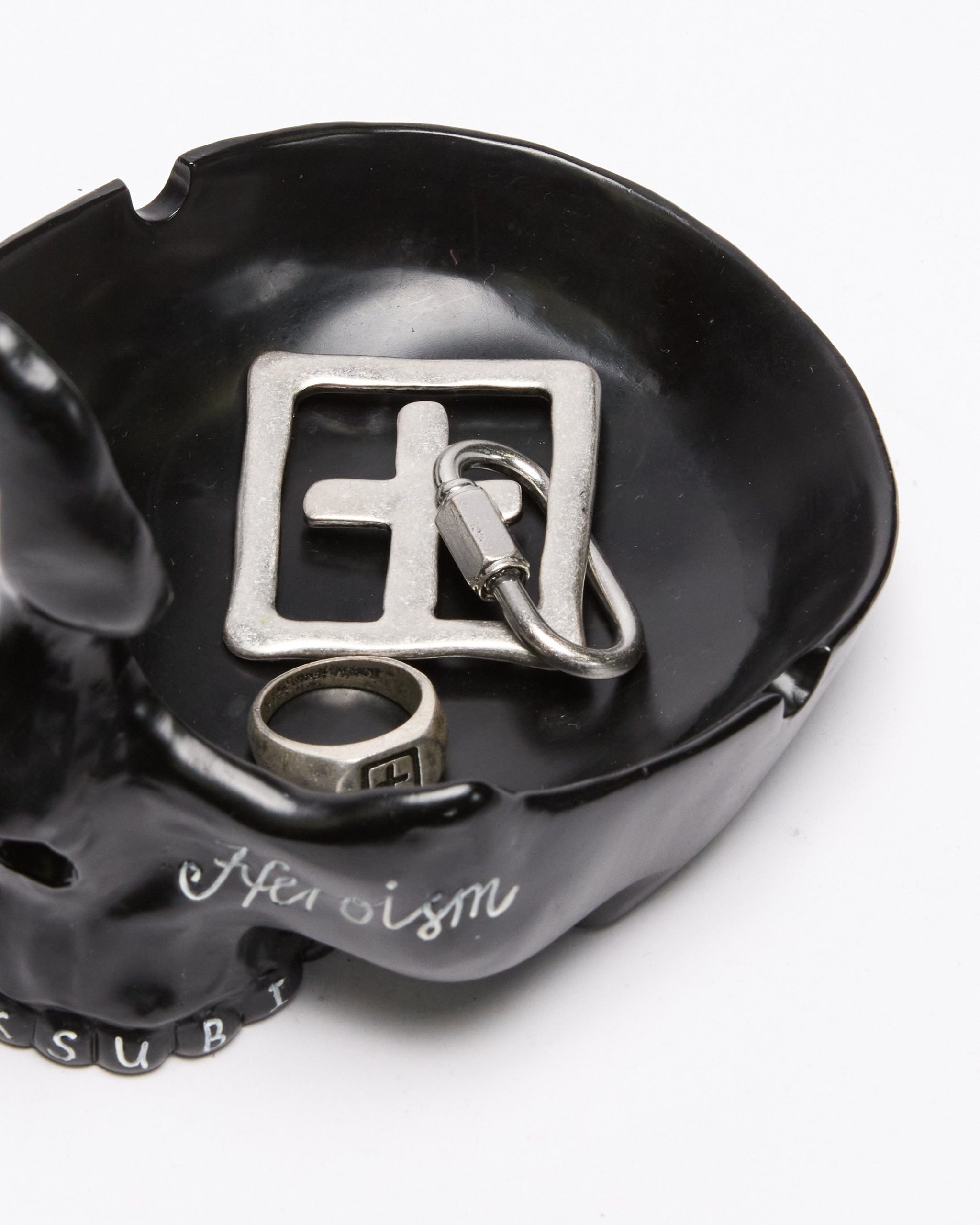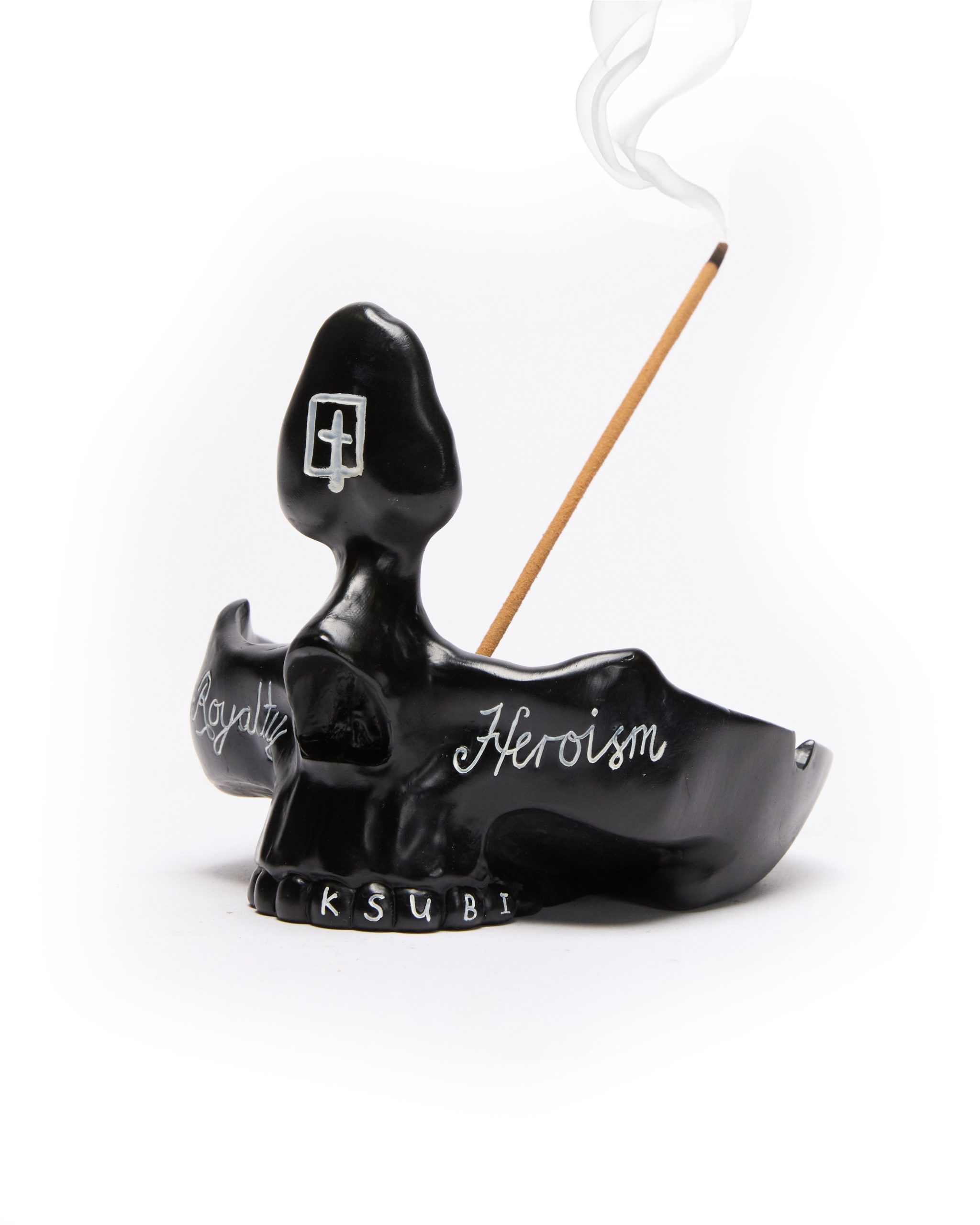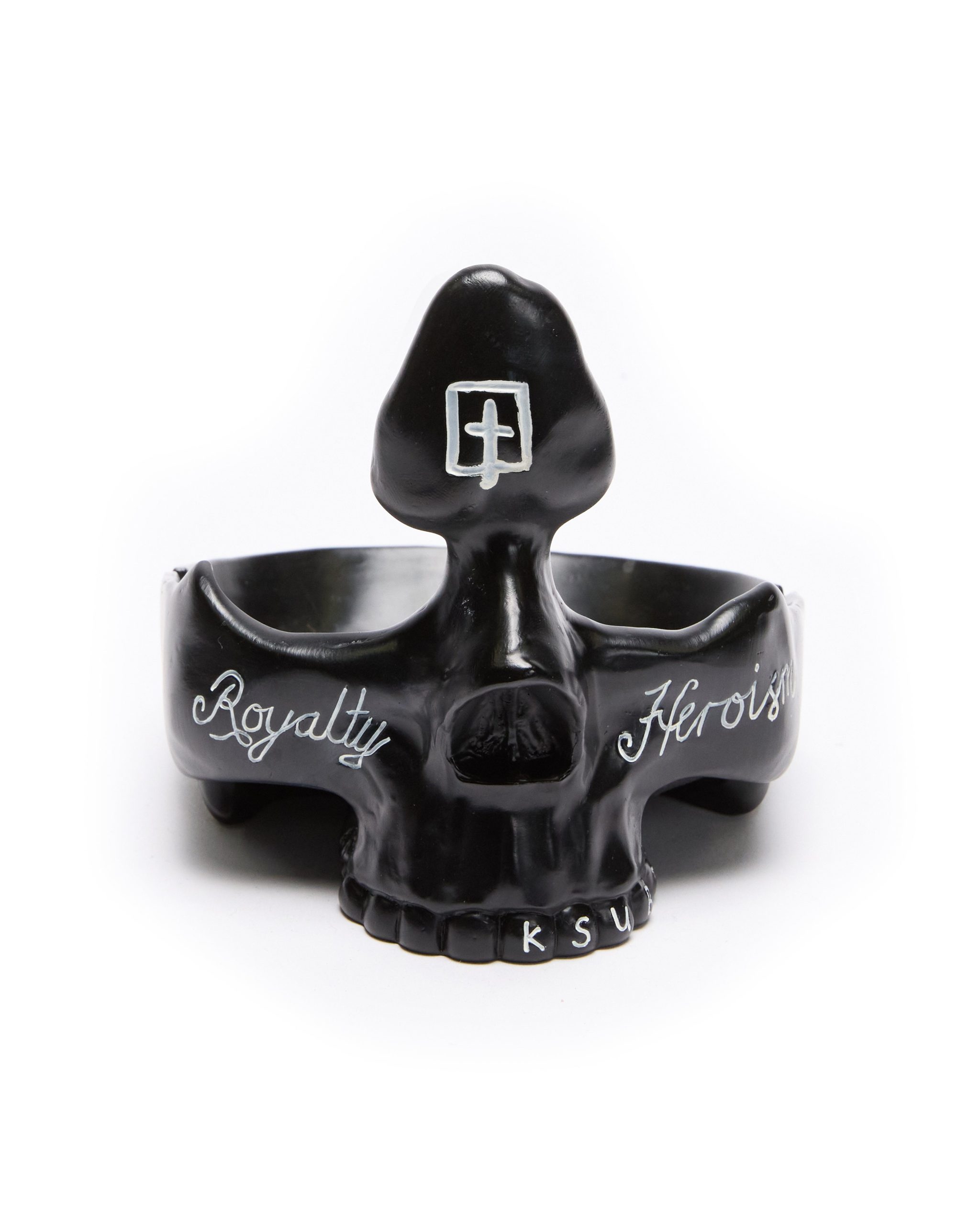The Brains Ashtray Black is a custom-crafted ceramic piece featuring Ksubi’s signature logos. including the Cross Box and 1999. Designed for versatility. it functions as an ashtray. tray. eyewear holder. and even includes an incense holder.