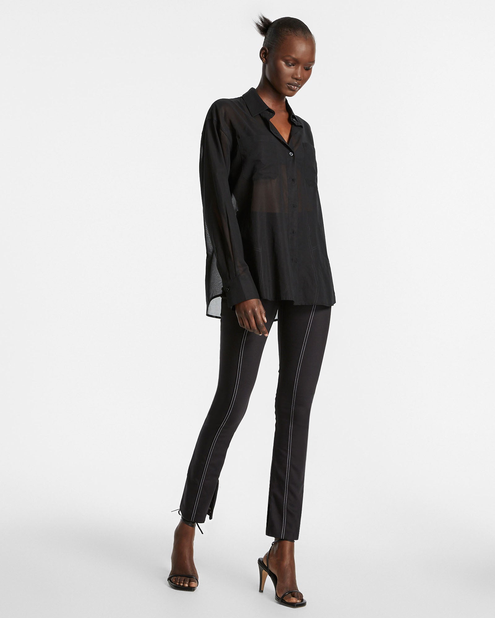 The Cher Shirt is a classic black collared shirt. with long sleeves and a curved hem. in a relaxed fit. Made from a premium cotton voile for a soft hand feel.