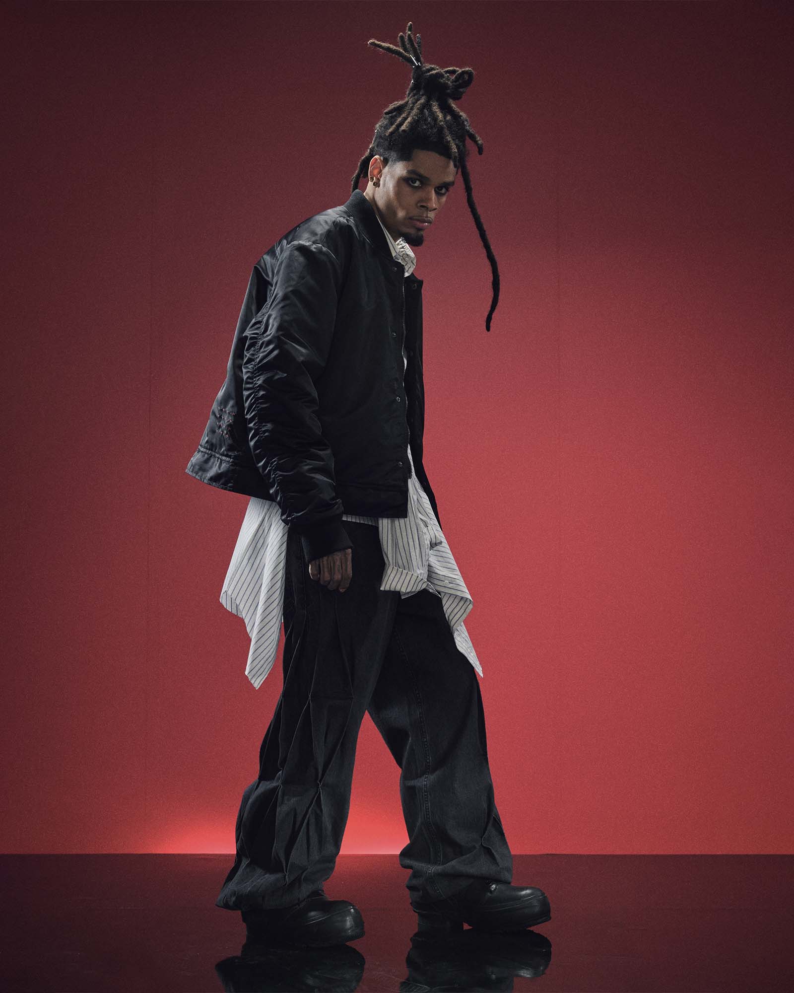 The Cosy Boy Jacket Black is an oversized. longline bomber jacket cut from a premium jet black nylon fabric. Featuring a zip off portion in the centre half for 2 different lengths. with details including the classic bomber jacket sleeve. Ksubi x Trippie Redd embroidered artwork. branded hardware and custom collaboration pocket tag on the sleeve.