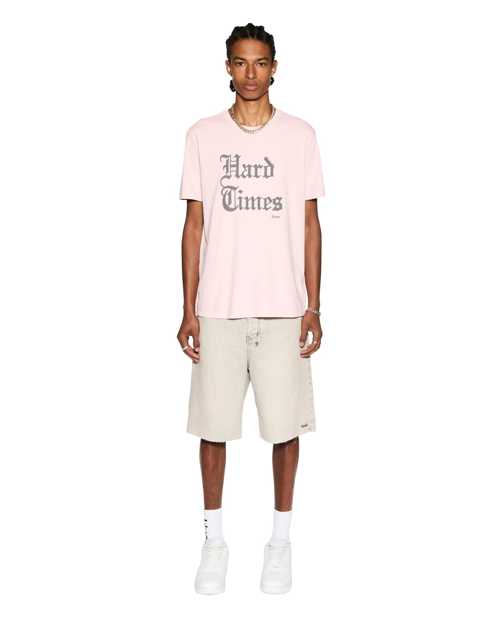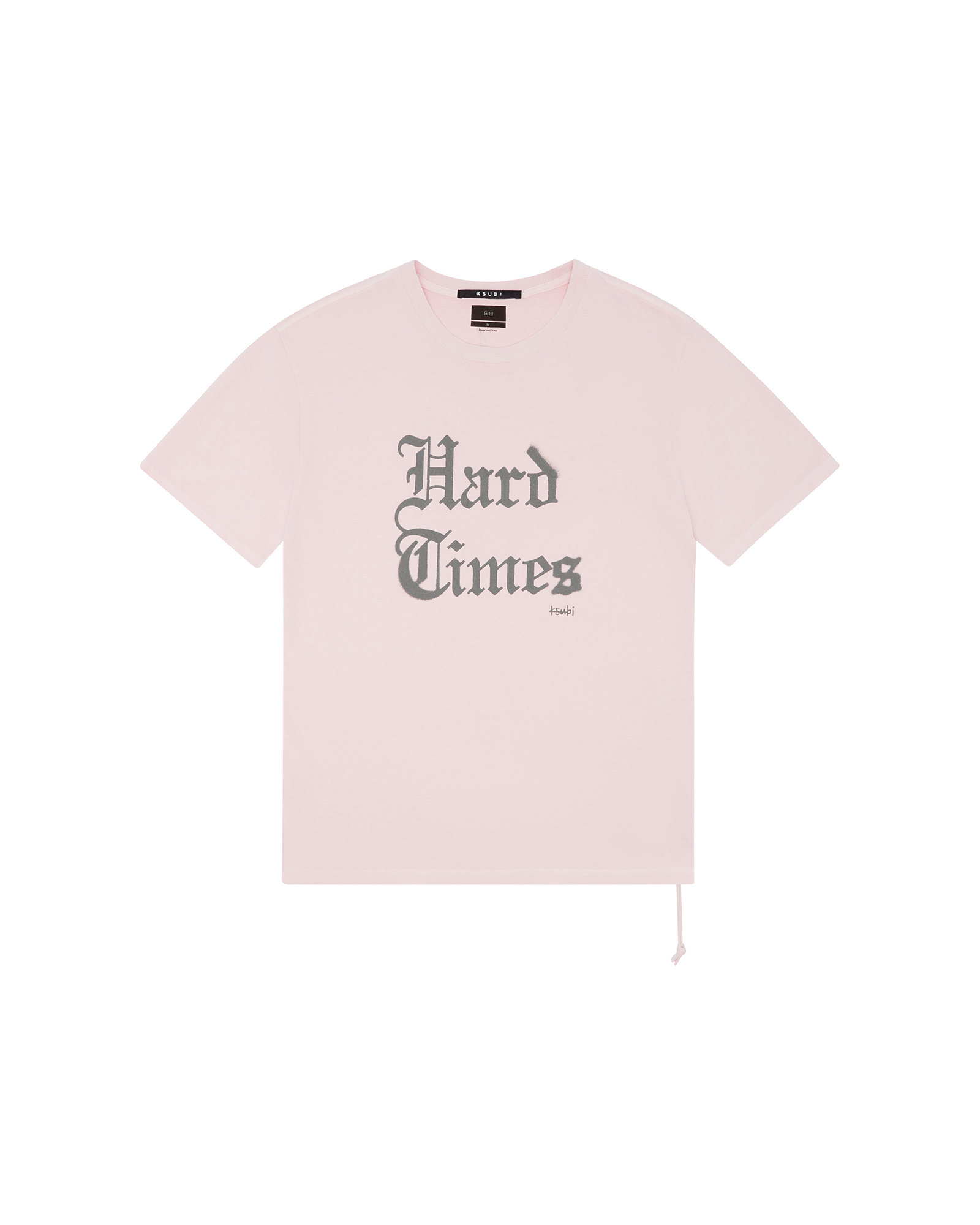 The Hard Times Kash Ss Tee Quartz is a short sleeve. crew neck T-shirt made from premium cotton in a pink quartz dye. The tee features a raw cut hem. signature Ksubi rats tail and Ksubi T-box branding.