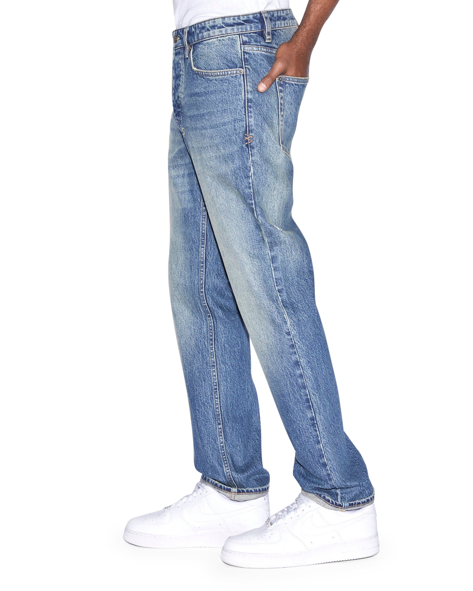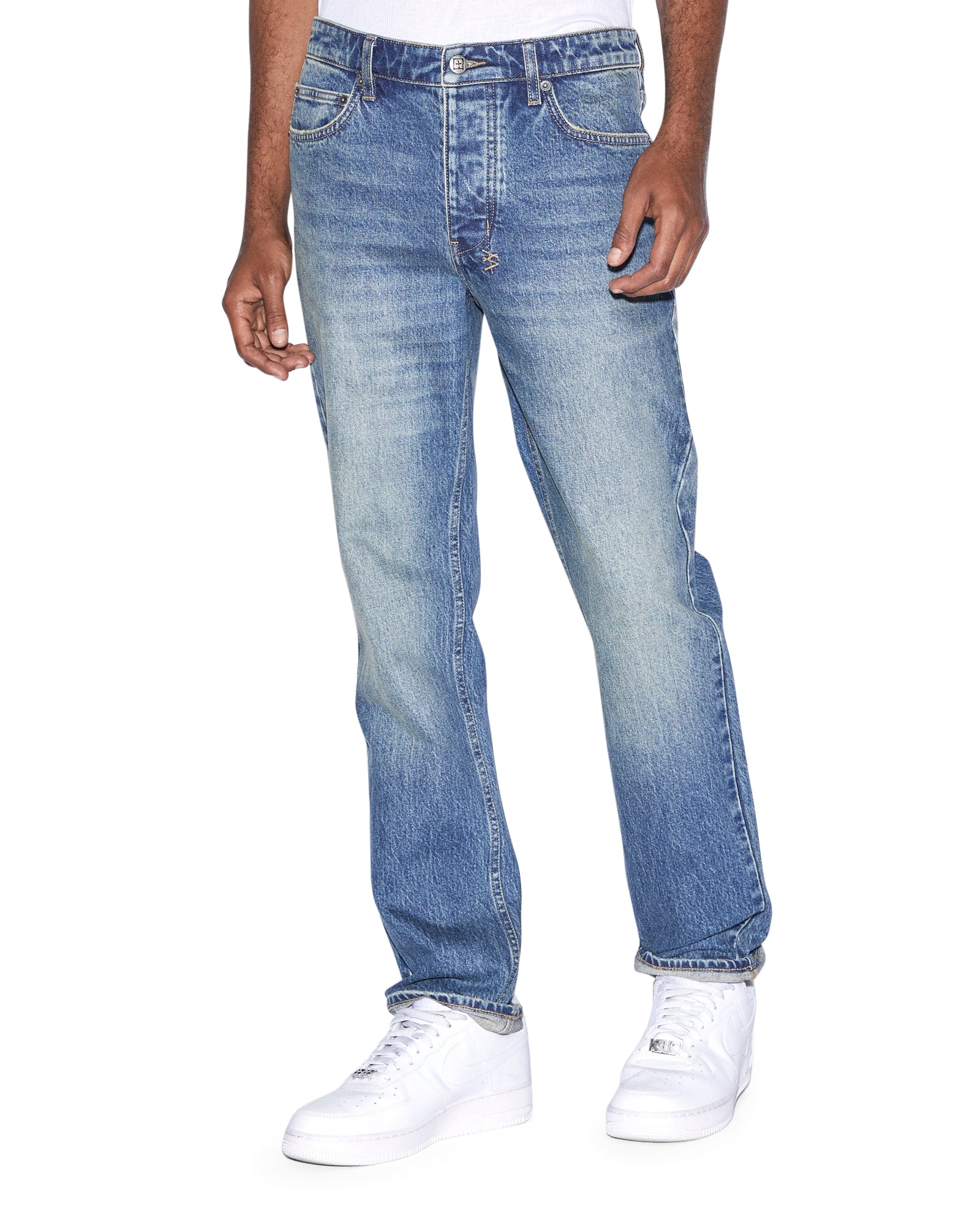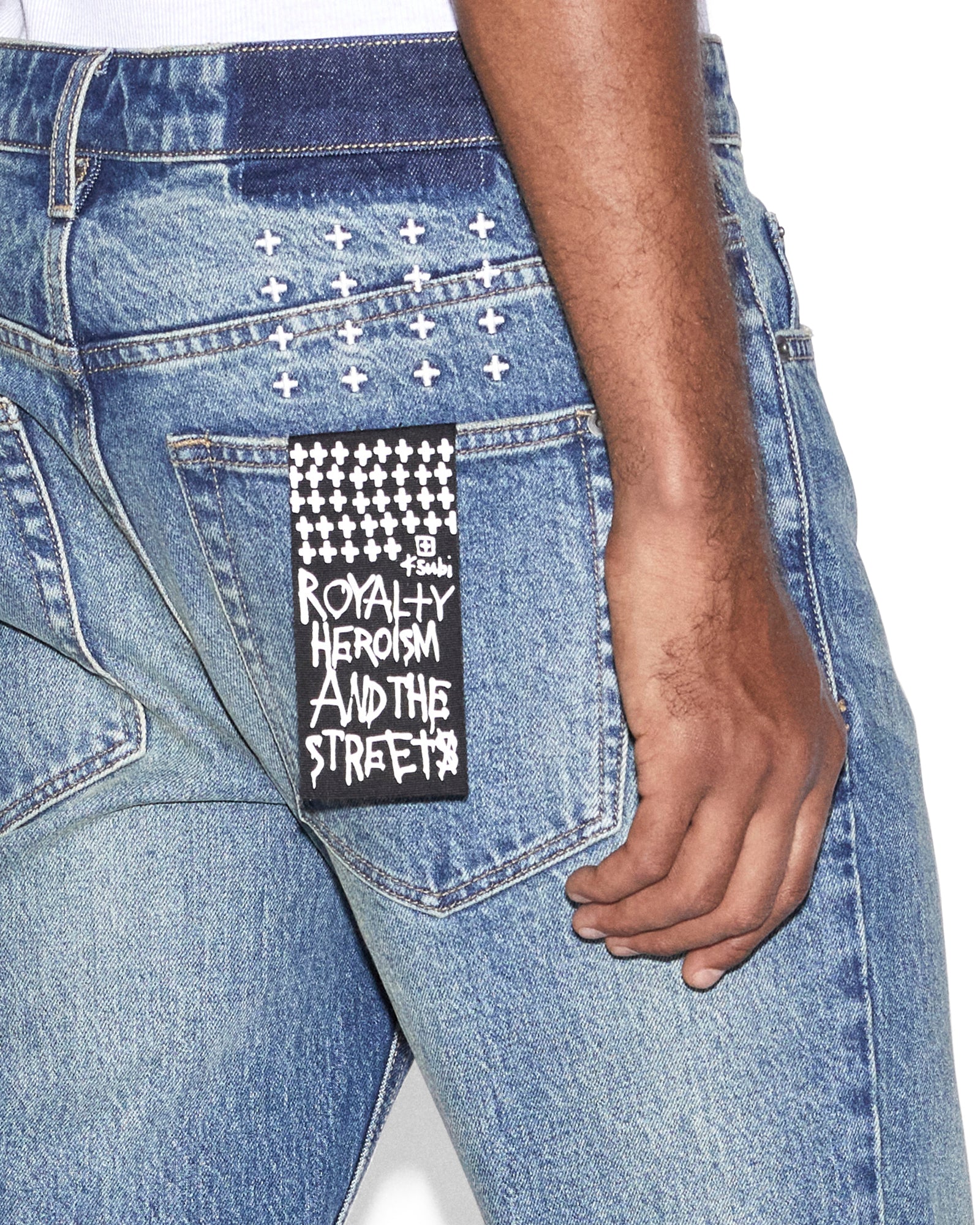 The Hazlow Chronicle is a mid-rise waisted jean with a full-length leg. Crafted from comfortable stretch indigo denim. in a light stone wash colourway with aging treatments. The standout feature of these jeans is the metal cross hot-fix application detailing down the leg. These jeans are finished with Ksubi’s signature t-box. 4×4 embroidery and branded hardware.