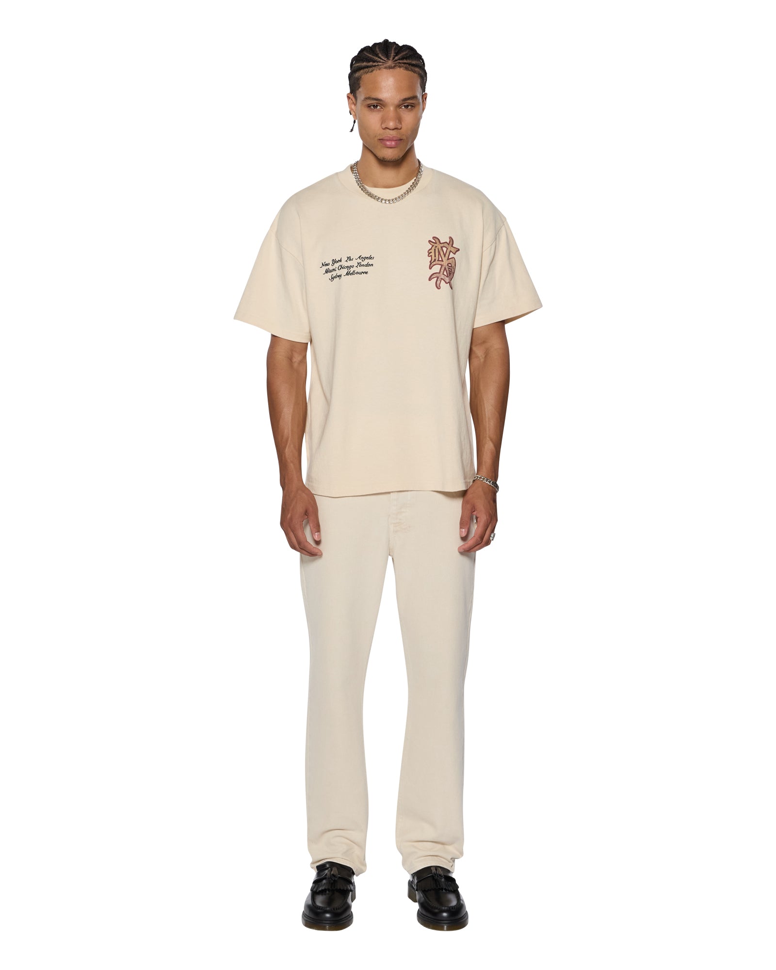 The Hazlow Ecru is a mid-rise relaxed straight leg with a regular leg opening. Made from rigid ecru colour denim with a light stone wash. it is finished with signature T-box and 4×4 embroidery. subtle ghost patching detailing. and Ksubi branded hardware.