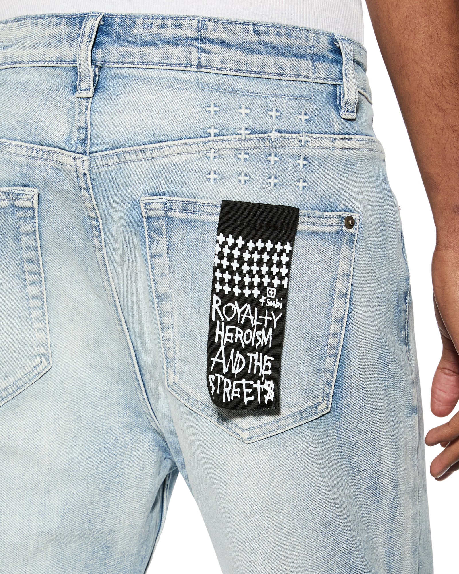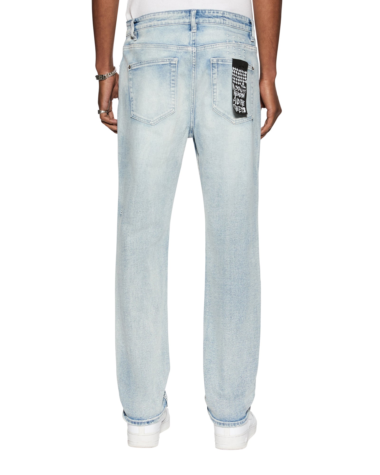 The Hazlow Legacy is a straight leg tapered jean. Made from a premium indigo coloured denim. the jean features 1999 logo embroidery at the knee.