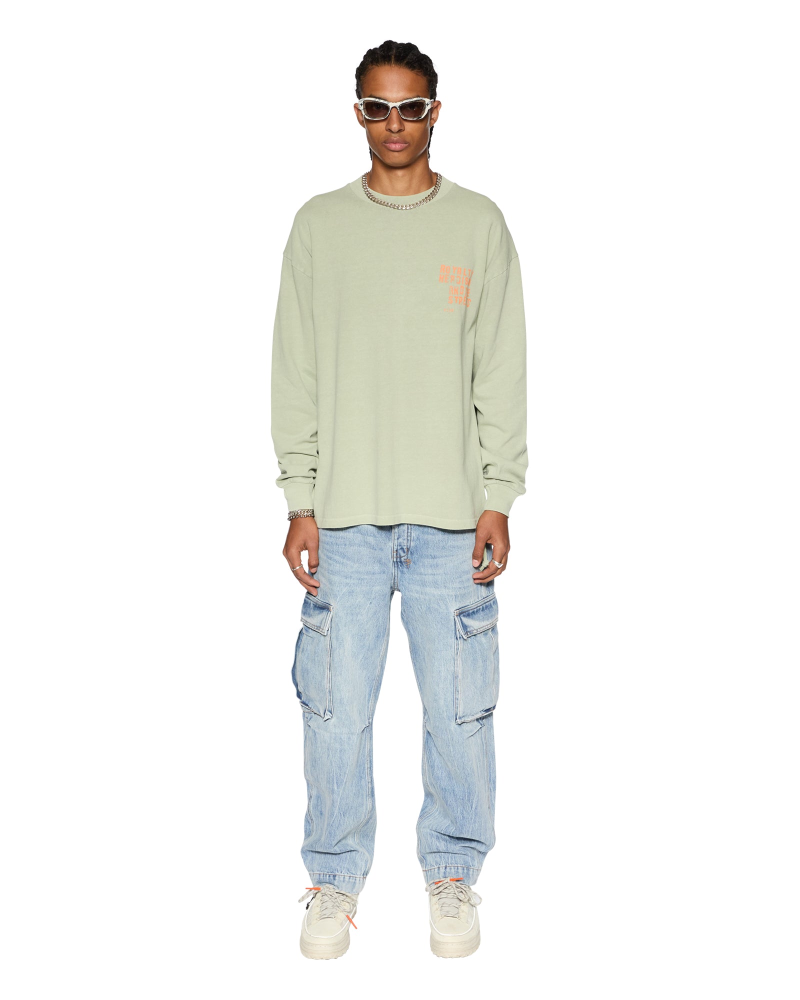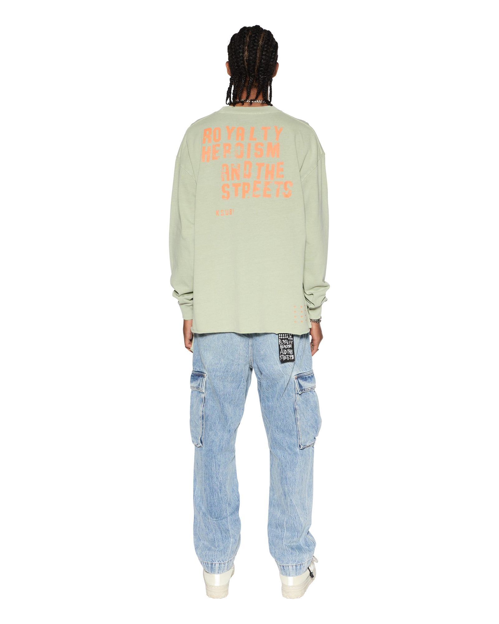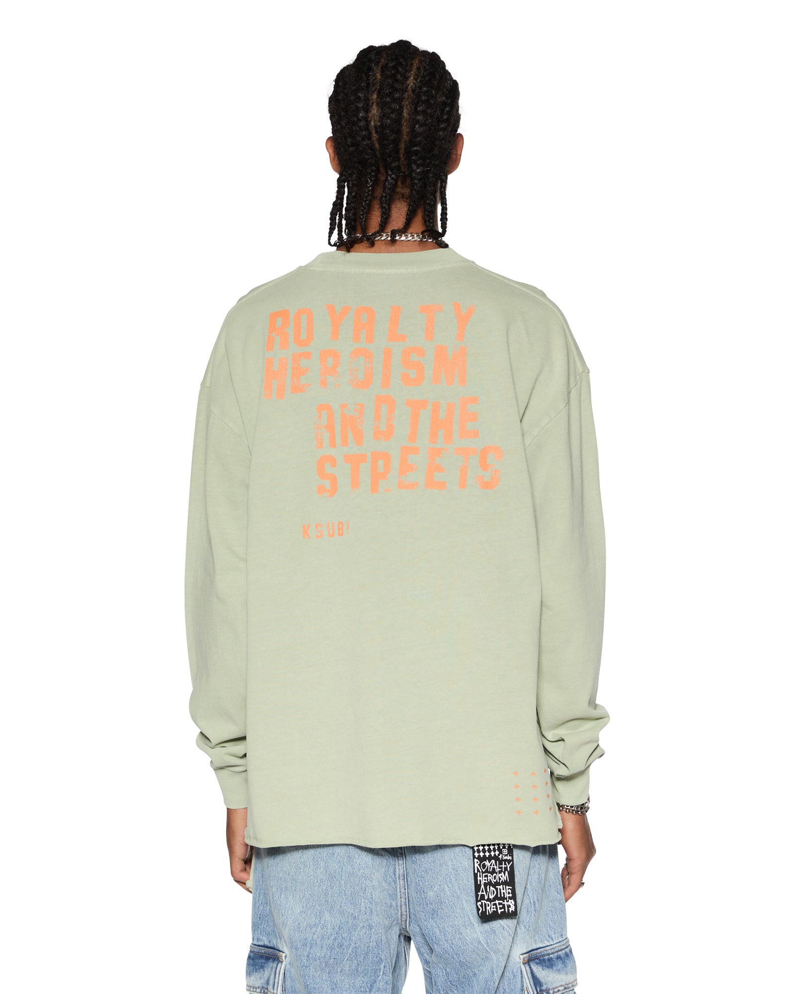 The Hero Ekcess Long Sleeve Tee Grass is a boxy. oversized fitting long sleeve t-shirt with a dropped shoulder and raw cut back hem. Made from premium heavy-weight cotton jersey in overdyed grass green with an aged wash. it features seasonal screen-printed artwork at the front and back. and is finished with T-box and 4×4 embroidery branding.