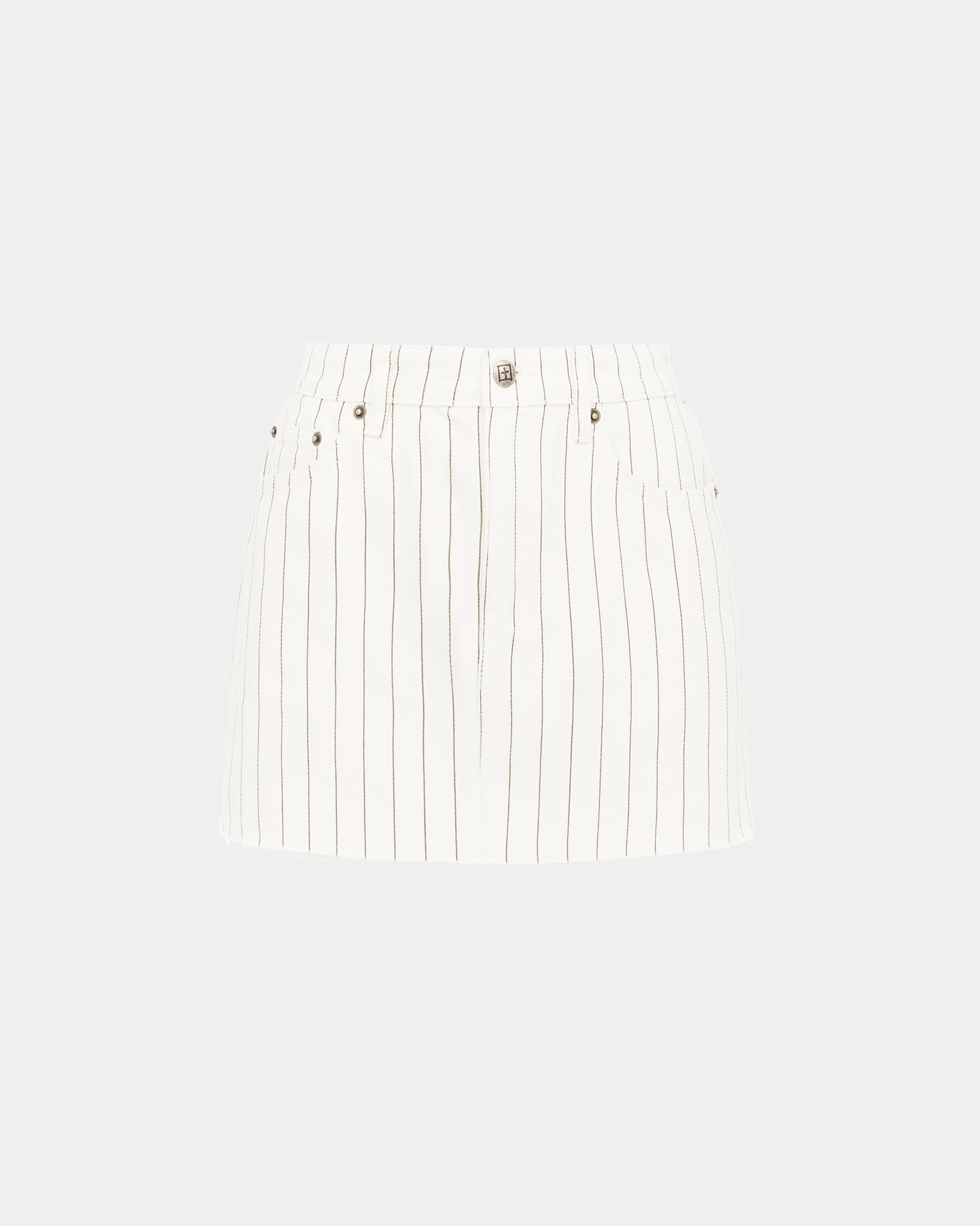 The Low Rider Mini Prophetik is a low rise mini skirt made from a rigid white denim with charcoal pinstripe. Designed to sit lower on the hips. this skirt is detailed with anti-silver branded hardware and white embroidered 3×4 and T-box branding on the back. Style back with the matching Idol Bustier Prophetik and layer the Oversized Shirt Prophetik for a three-piece denim set.