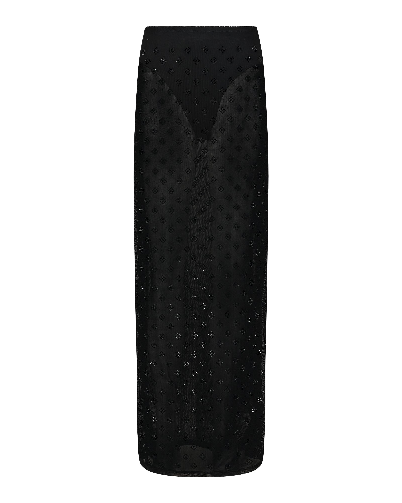 The Maxi Skirt Diamonte is a low-rise. slim-fit maxi skirt made from premium stretch mesh fabrication. Featuring custom T-box hot fix crystal yardage. a scalloped elasticated waistband. and a detachable brief lining. style it back with the Mesh SS Top Diamonte.