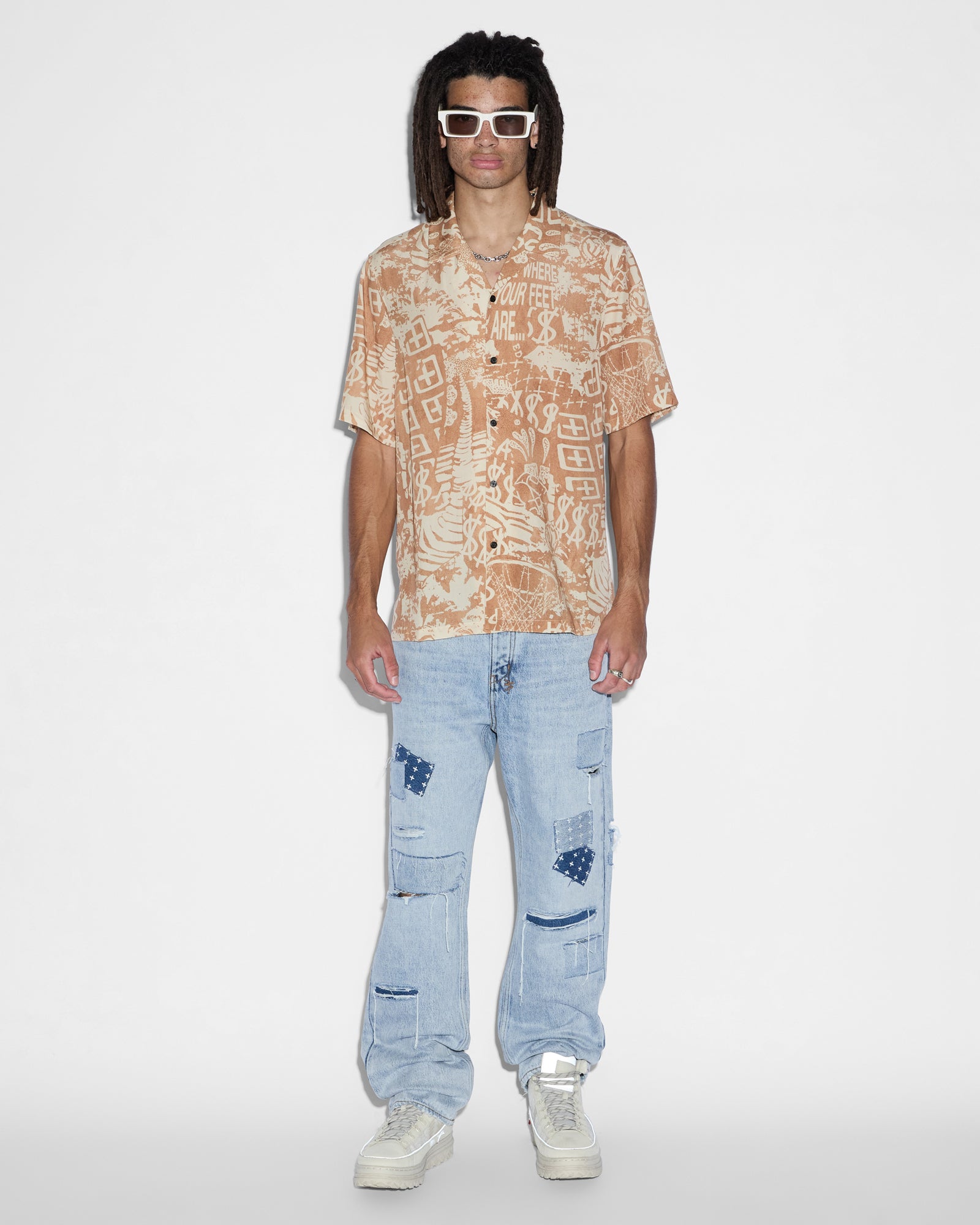 The Mills Ikon Resort Ss Shirt Multi is a short sleeved. relaxed shirt made from a premium lightweight tencel fabric. This resort shirt has an all over custom print. branded buttons down the centre front and a Ksubi x Patty Mills collaboration t-box print.