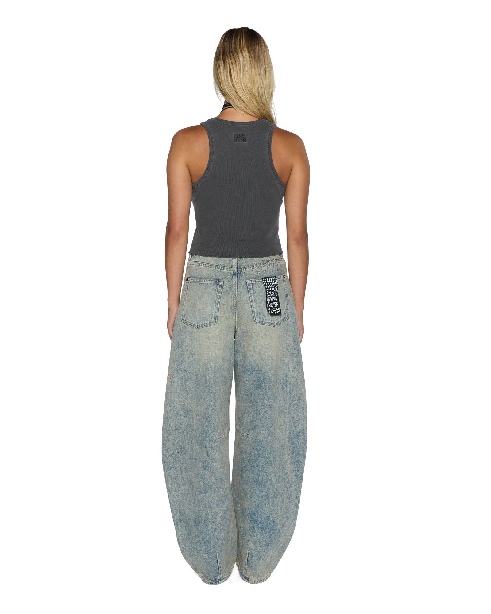 The Origin Tank Garter Charcoal is a scoop-neck fitted tank top. with a racerback design. Made from premium lightweight cotton rib. it features garter-style straps at the front hem. finished with Ksubi-branded hardware. Additional details include Ksubi stacked embroidery at the back neck and signature T-box embroidery. An elevated branded essential that pairs effortlessly with any Ksubi denim.
