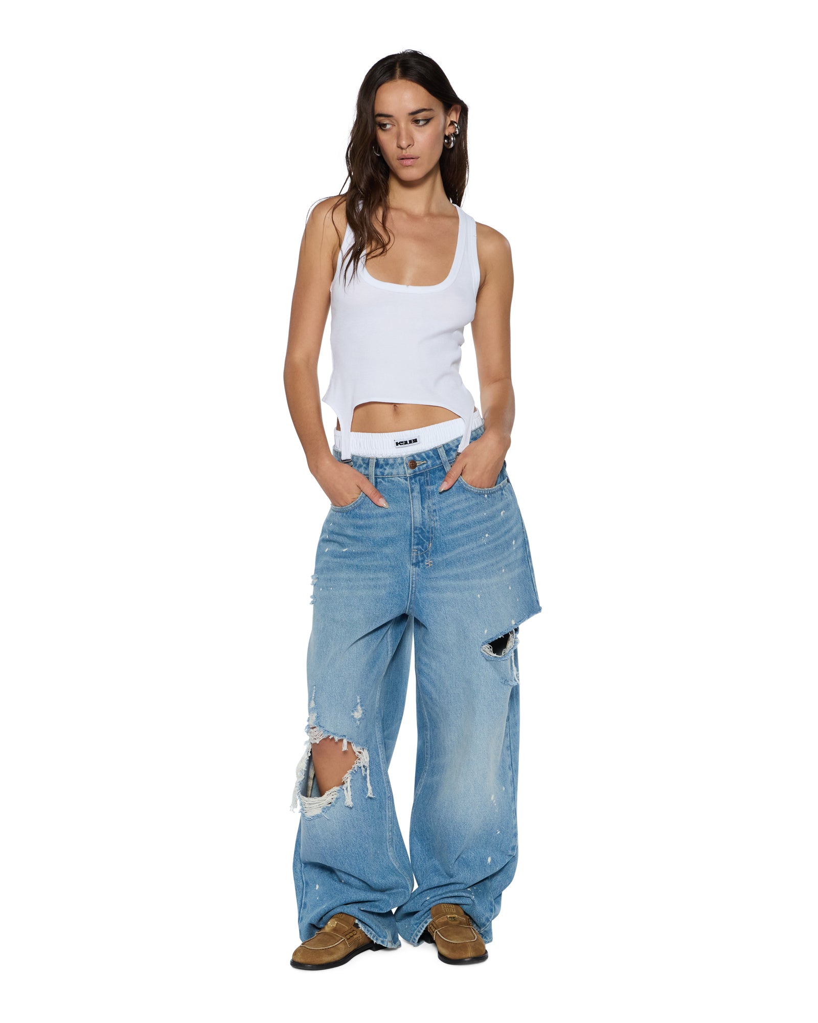 The Origin Tank Garter White is a scoop-neck fitted tank top in White colorway. offering a racerback design with a cropped length. Made from premium lightweight cotton rib. it features garter-style straps at the front hem. finished with Ksubi-branded hardware. Additional details include Ksubi stacked embroidery at the back neck and signature T-box embroidery. An elevated branded essential that pairs effortlessly with any Ksubi denim.