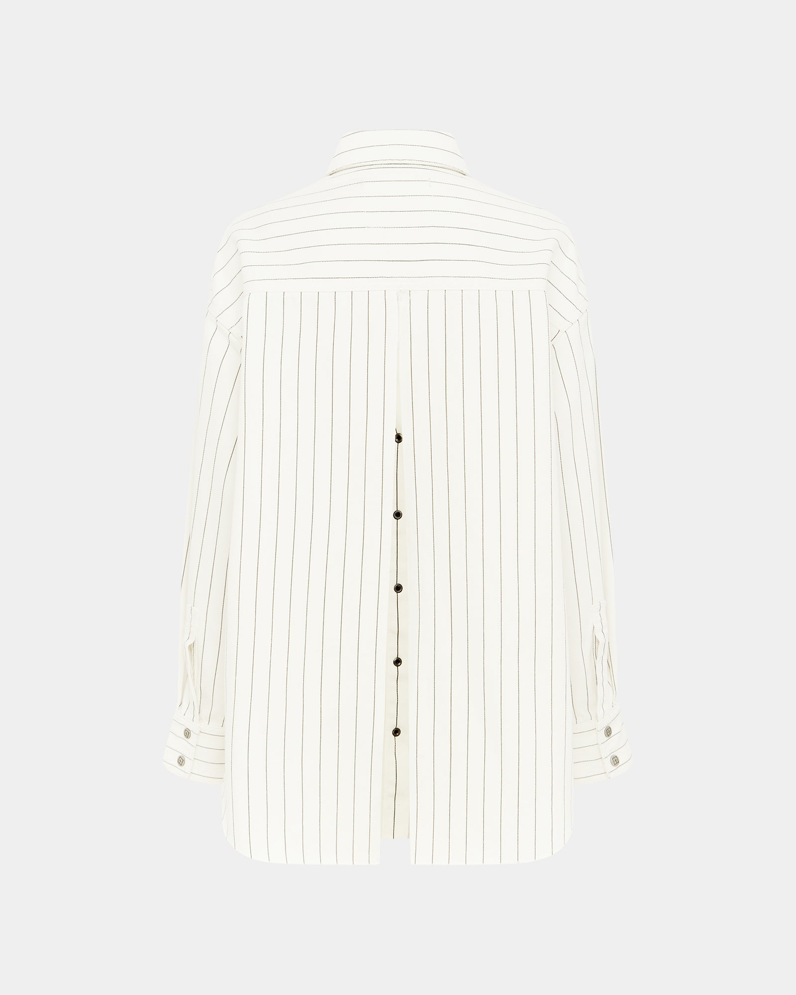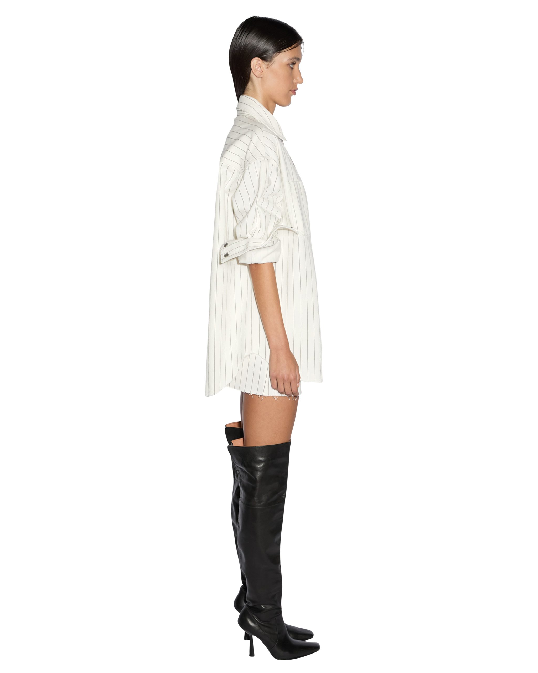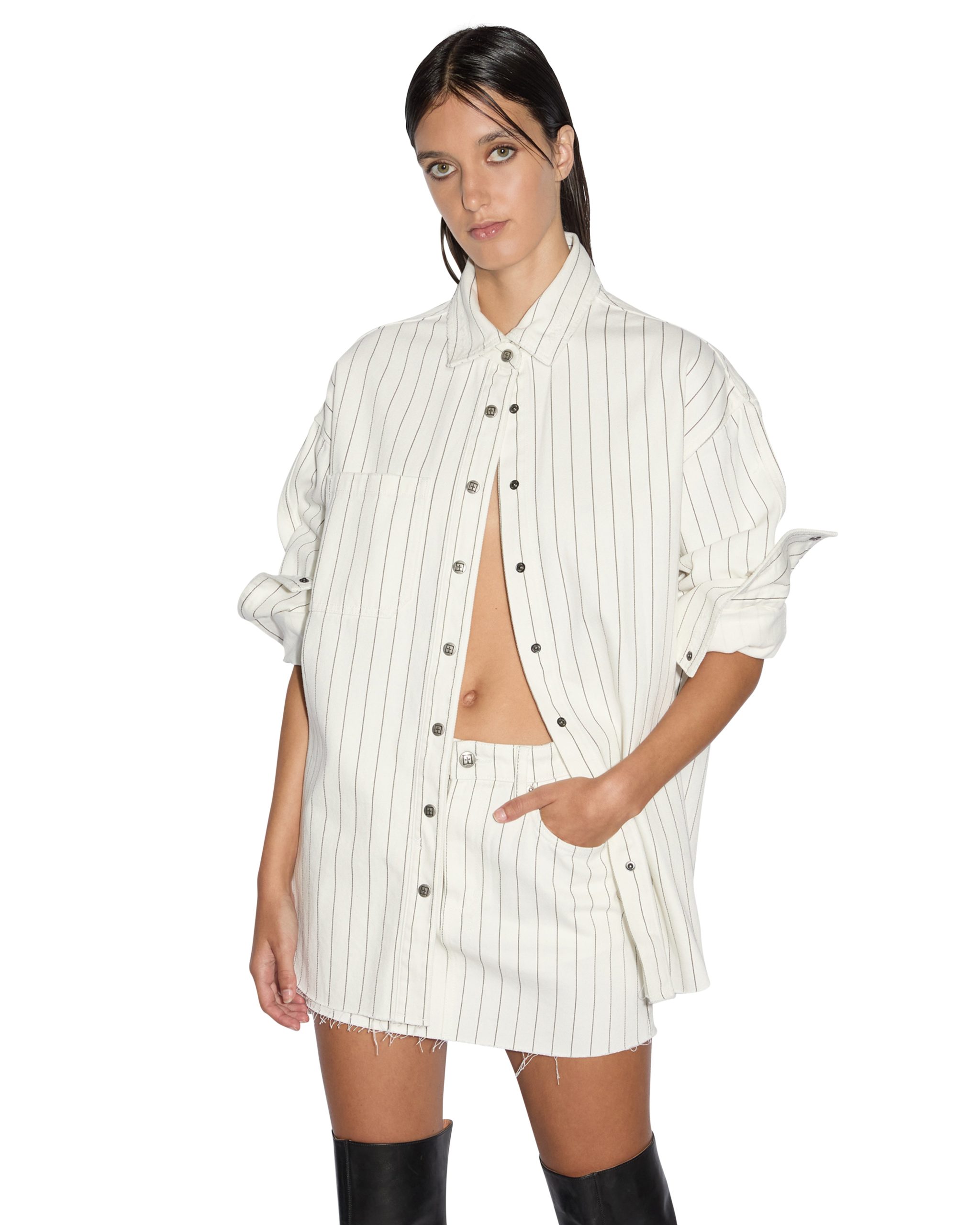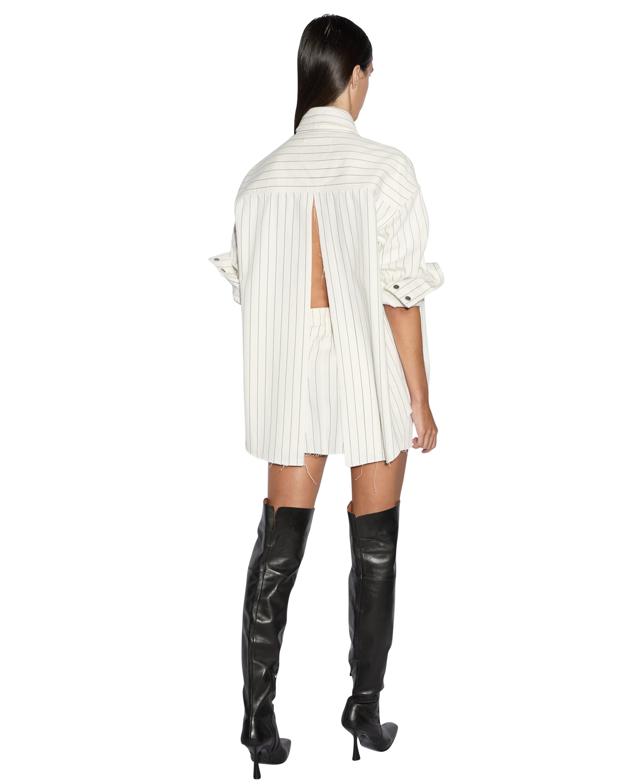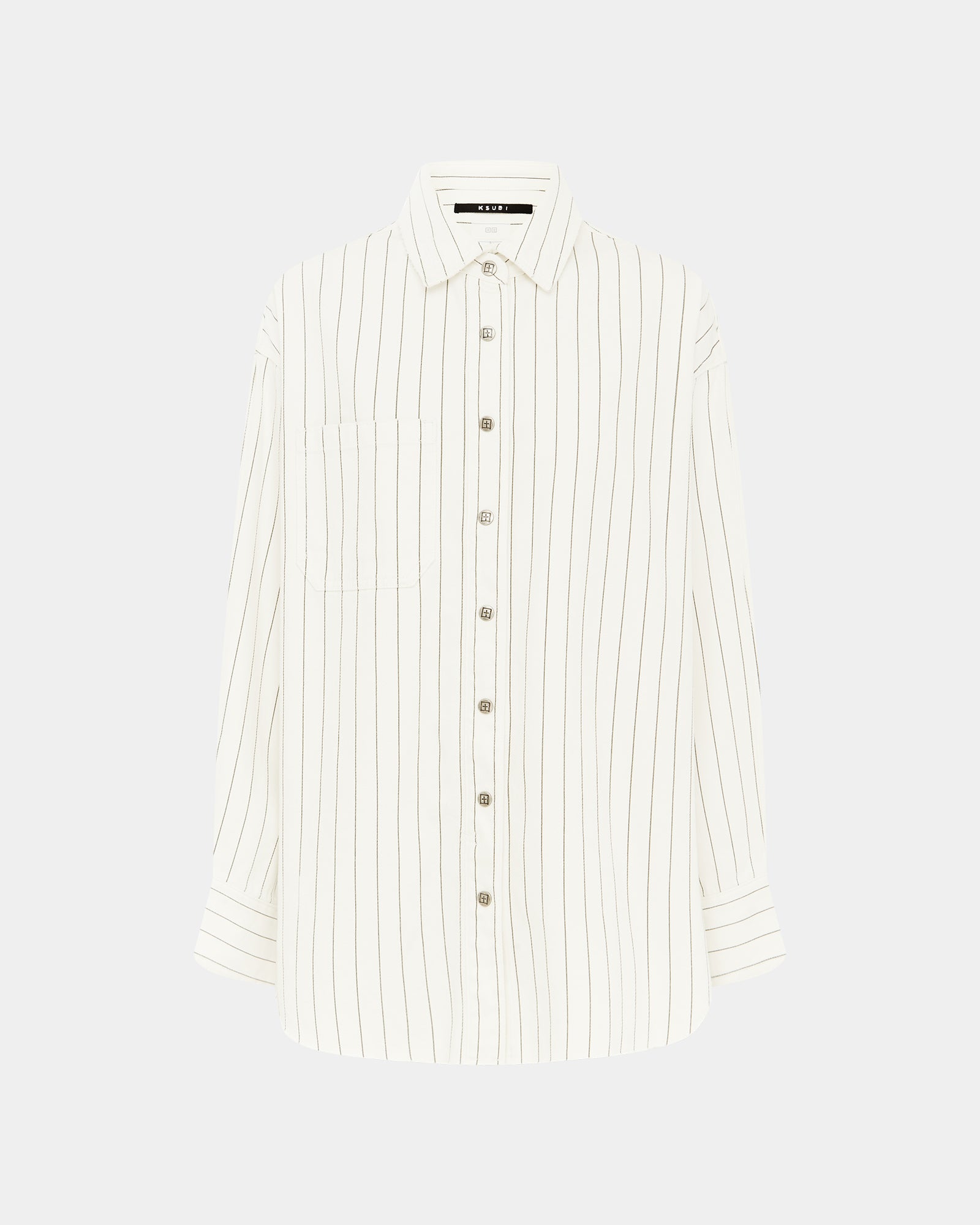The Oversized Ls Shirt Prophetik Slice is button through shirt made from a rigid lightweight white denim with charcoal pinstripe. This oversized denim shirt features a raw cut split at the centre back creating an opening. Finished with Ksubi branded embroidery and hardware. with patch pockets at the front and a curved hem. Style back with the matching Low Rider Mini Prophetik for a double denim look.
