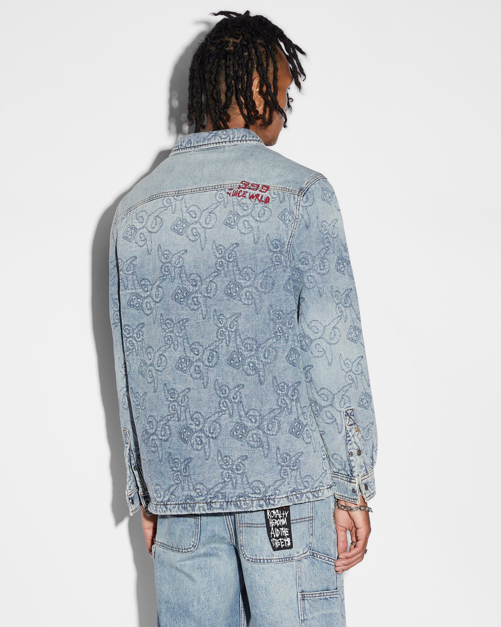 The Quilted Ls Shirt K9 Stoned is a relaxed fit long-sleeve shirt featuring a snap button placket. shank button collar closure. front patch pockets with a snap closure. and a padded lining. Made from a rigid 10oz indigo denim in a light blue stone wash. the shirt is finished with Ksubi x JuiceWrld yardage embroidery and original artwork embroidery placements. Details include Ksubi x JuiceWrld t-box branding. and Ksubi x JuiceWrld branded hardware.