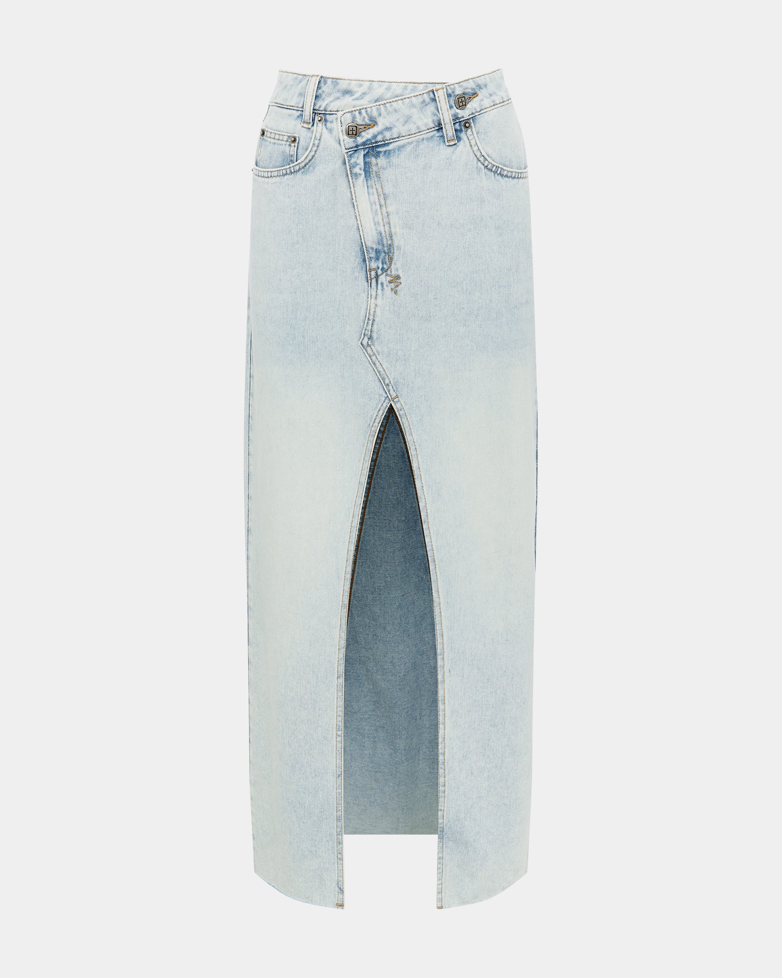 The Relax Maxi Skirt Skyfall is a light blue denim skirt with a high front split detail. This maxi skirt has a mid-rise waist and an asymmetrical fly detail at the front. Featuring subtle grinding. t-box and 3×4 embroidery on the back and a removable pocket tag. Size-up for a relaxed fit to sit lower on the hips.