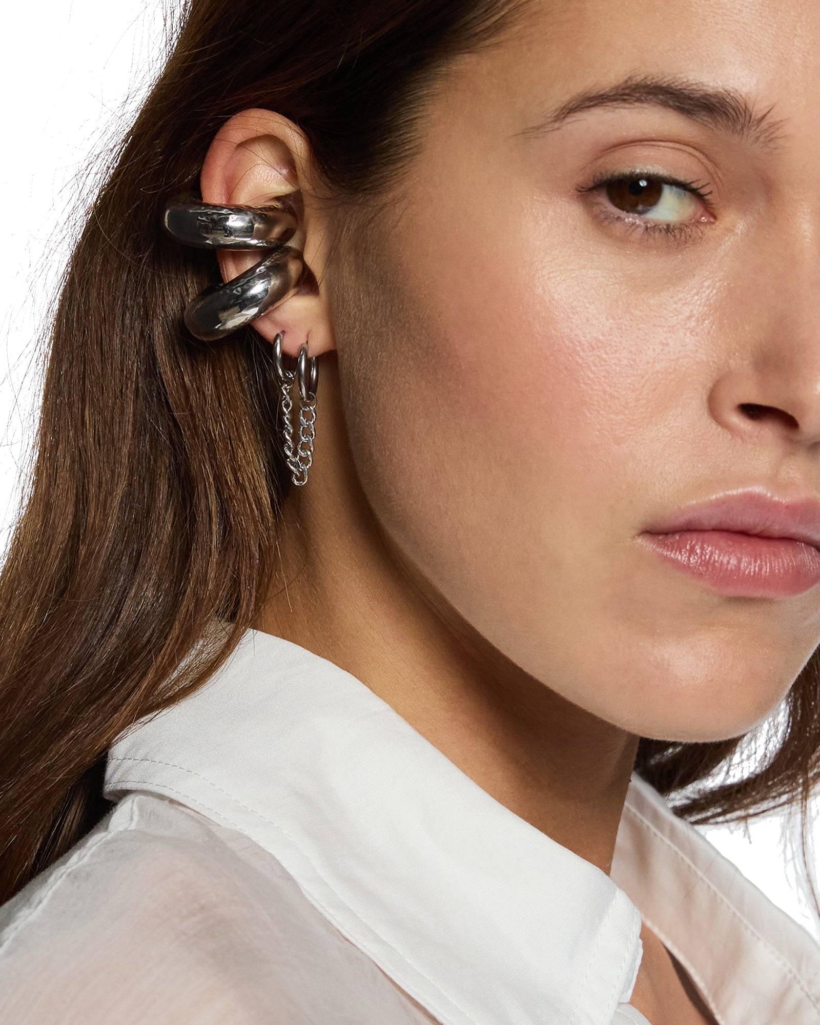 The Silver Chainlink Huggies are a contemporary reinterpretation of the classic huggie earring. Made from premium stainless steel. each pair features a delicate drop chain. offering a refined interplay of movement and industrial edge�hand-assembled with meticulous care.