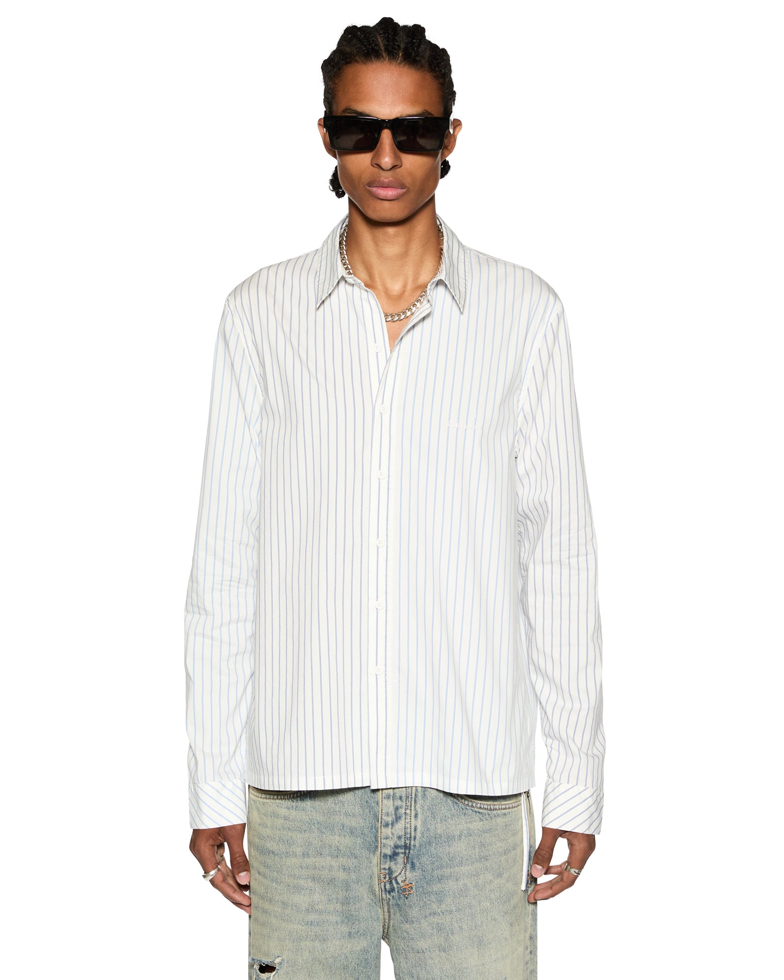 The Skript Long Sleeve Shirt 2 Stripe is a relaxed fit long sleeve button-down shirt made from classic pinstripe cotton poplins. It features traditional placket and sleeve closure. back yoke with twin pleats. a signature rats tail. contrast pinstripe fabric. seasonal embroidered artwork. and is finished with t-box embroidery and ksubi branded hardware.