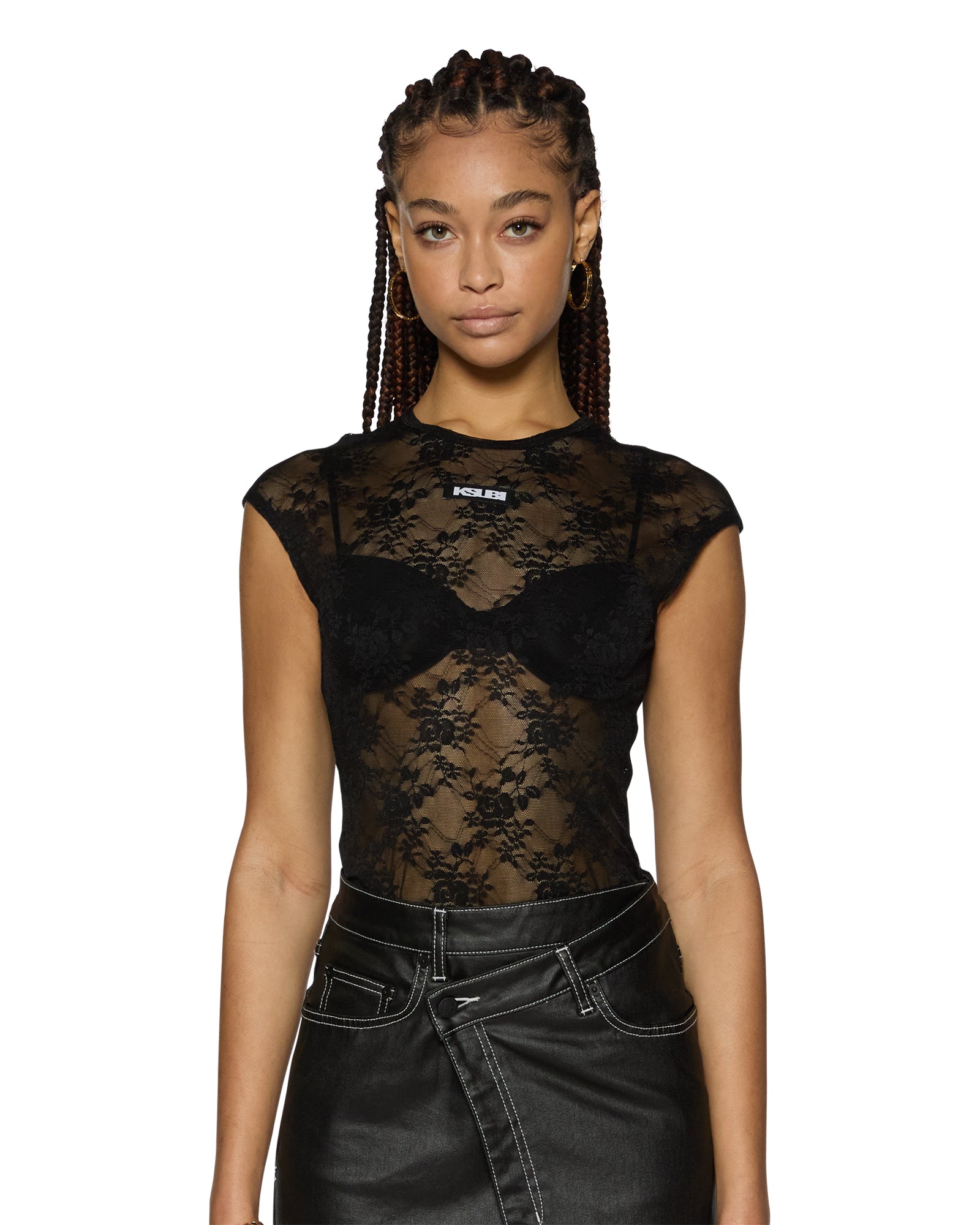 The Slim Tee Black Lace is a slim fit mock neck cap sleeve tee made from premium stretch lace. It features a floral motif and SOTT embroidery on the front chest. along with T-box embroidery.