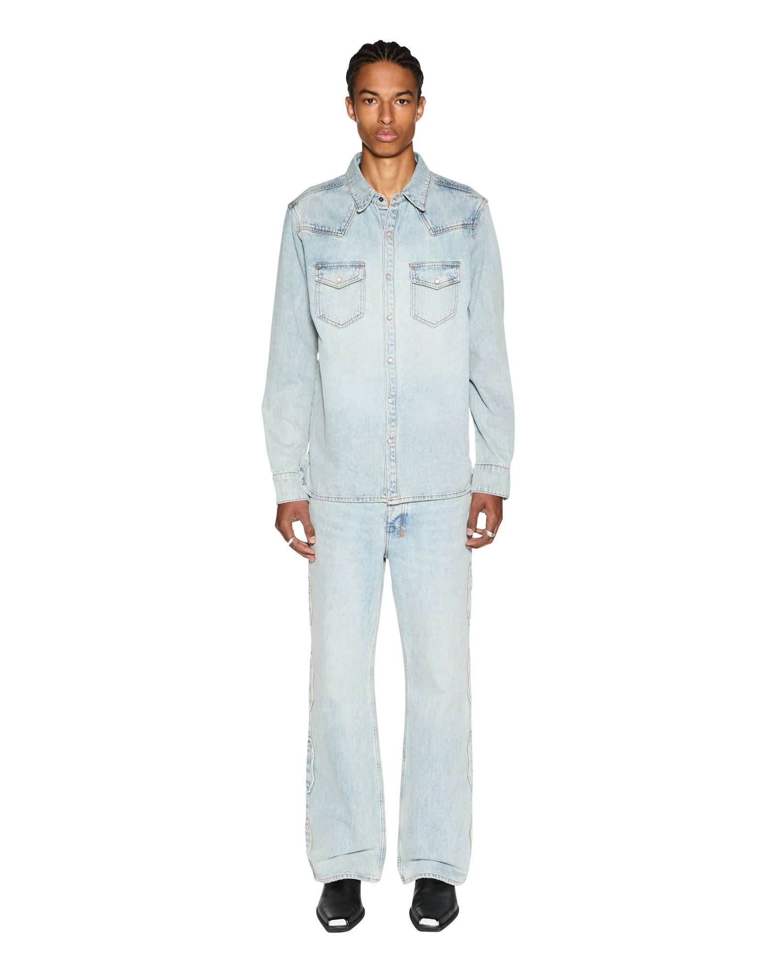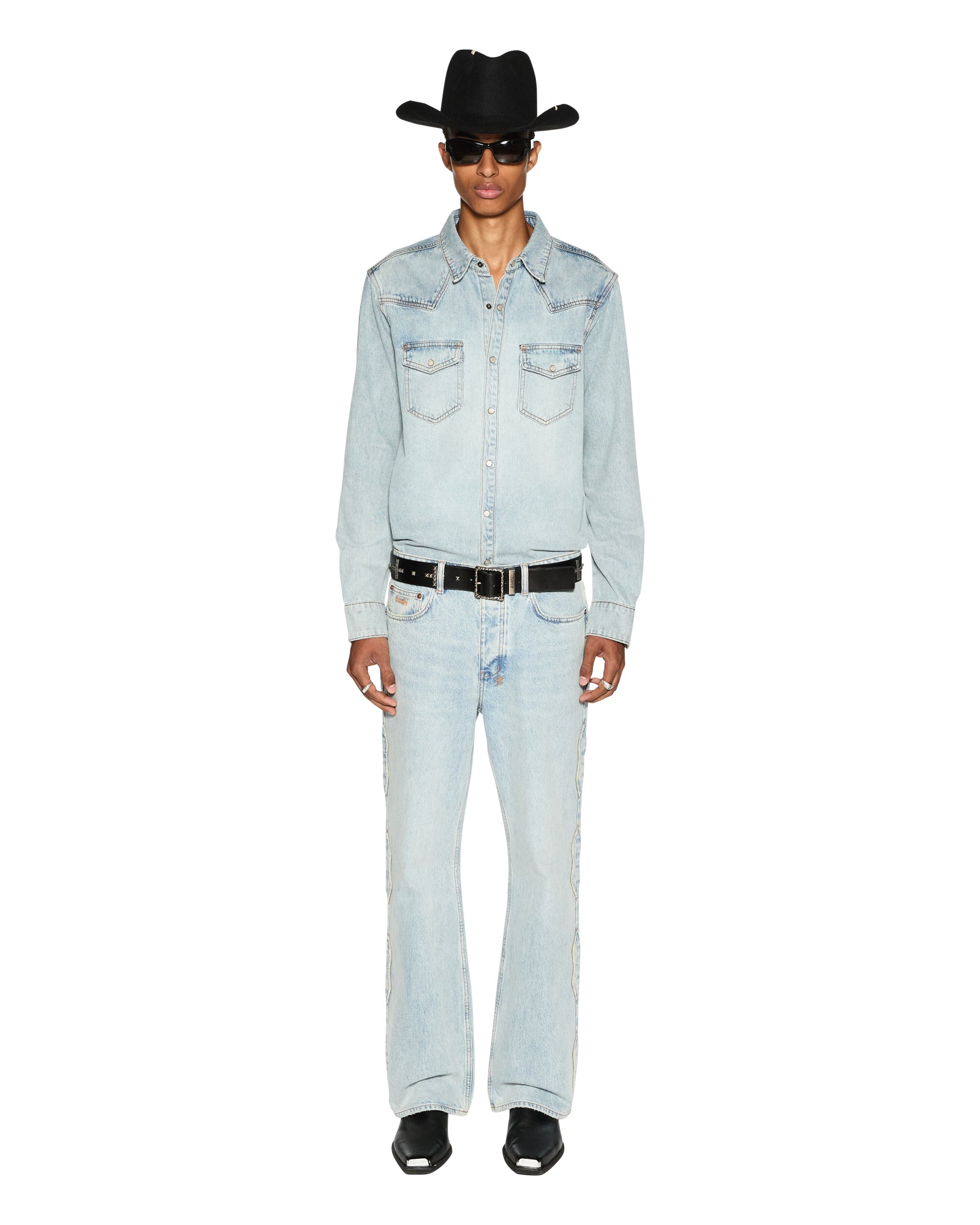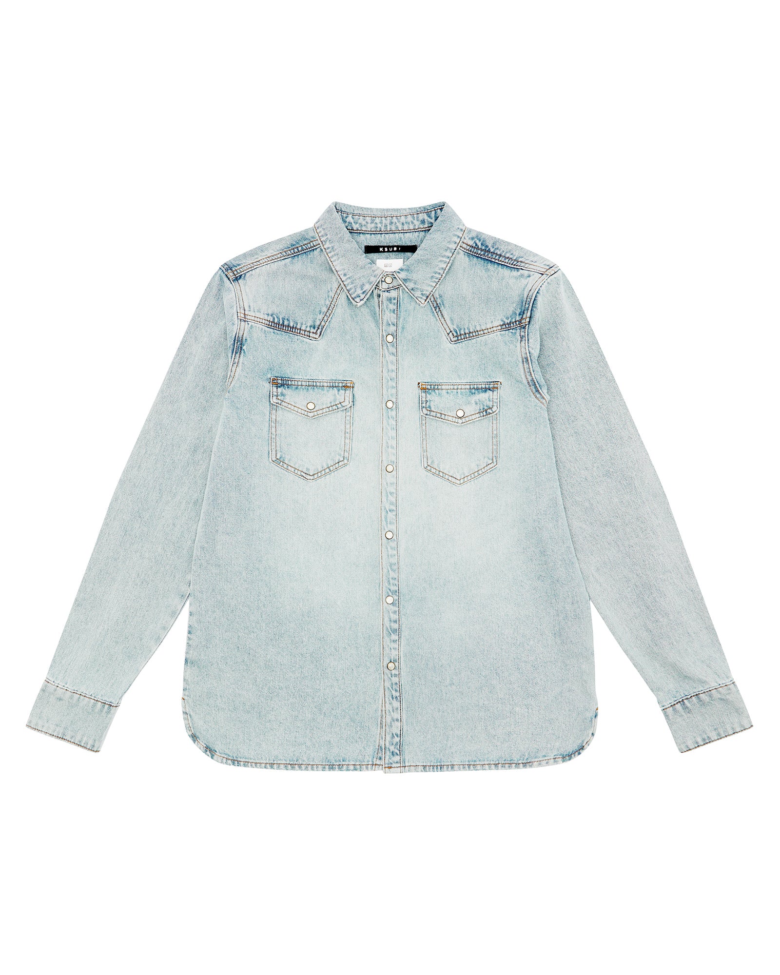 The Whiplash Long Sleeve Shirt Paragon is a fitted denim shirt made from 100% stone washed cotton. It features tobacco colored topstitching. western-style pockets. and pearl snap buttons on the front.
