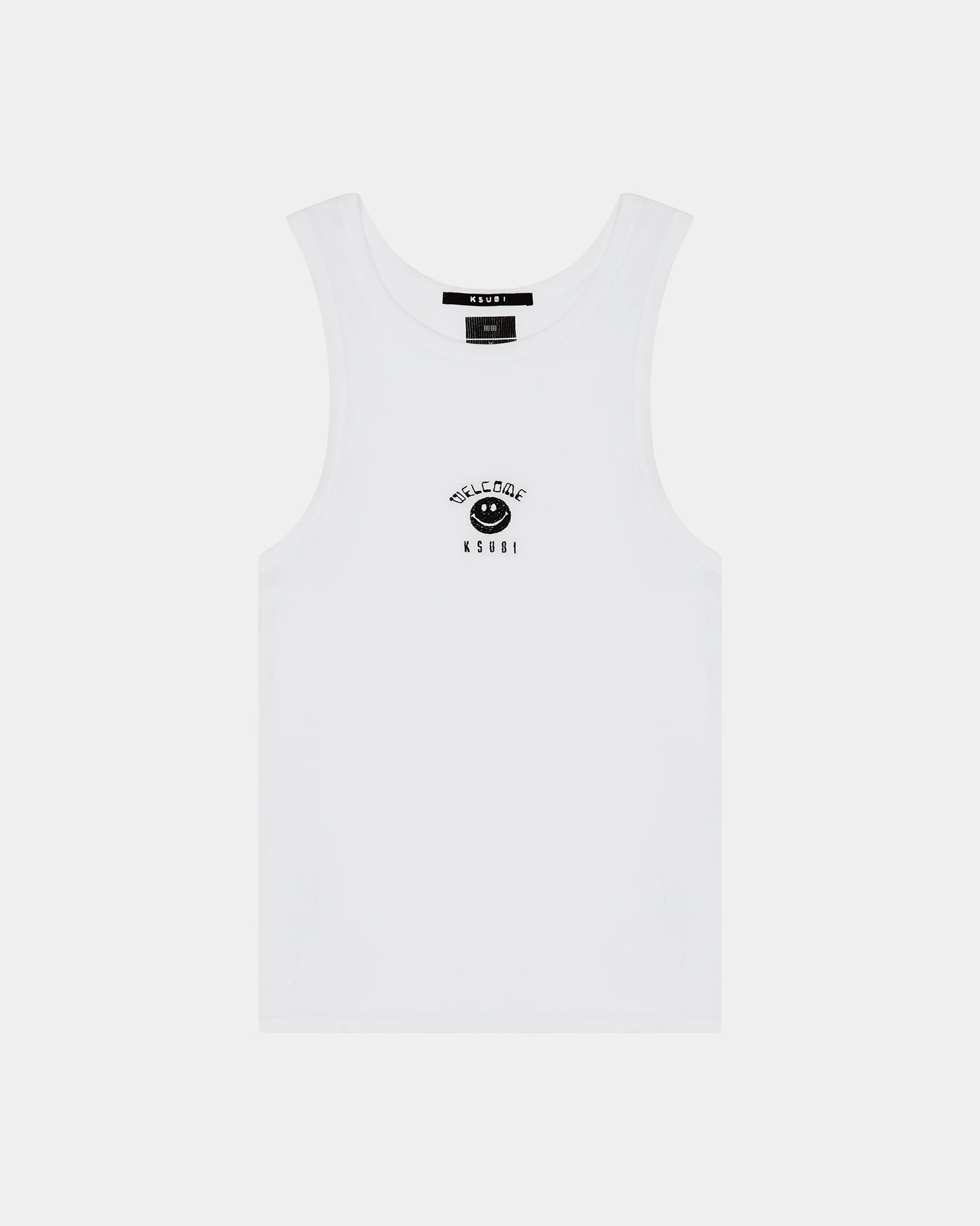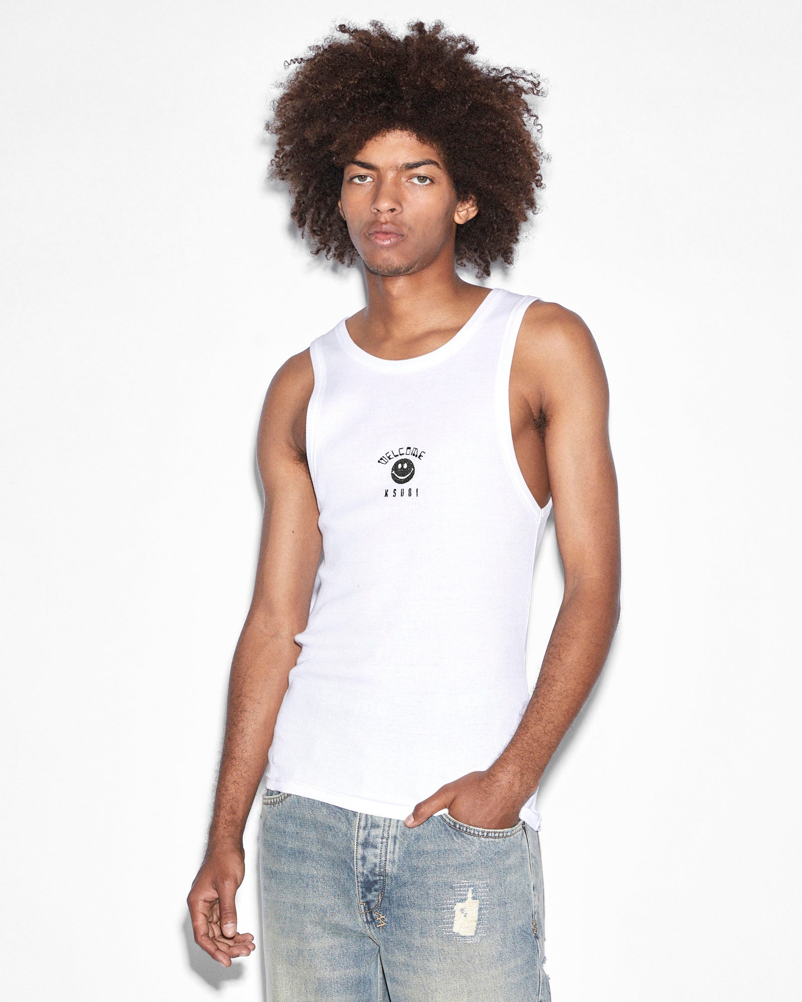The Zine Debut Singlet is a classic fit ribbed singlet with bound side seams. Crafted from premium white ribbed cotton. this style features embroidered artwork and is finished with t-box embroidery on the back.